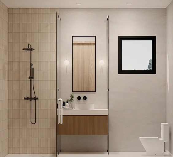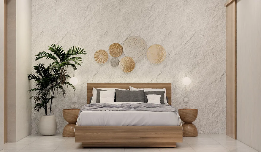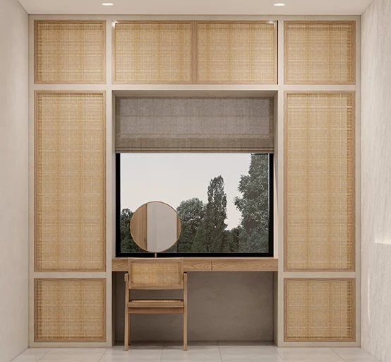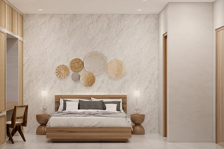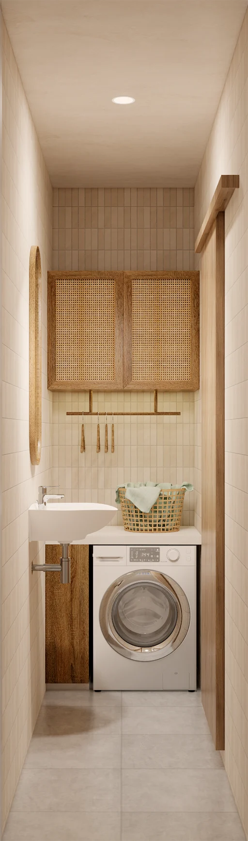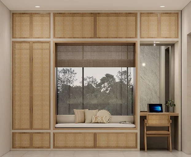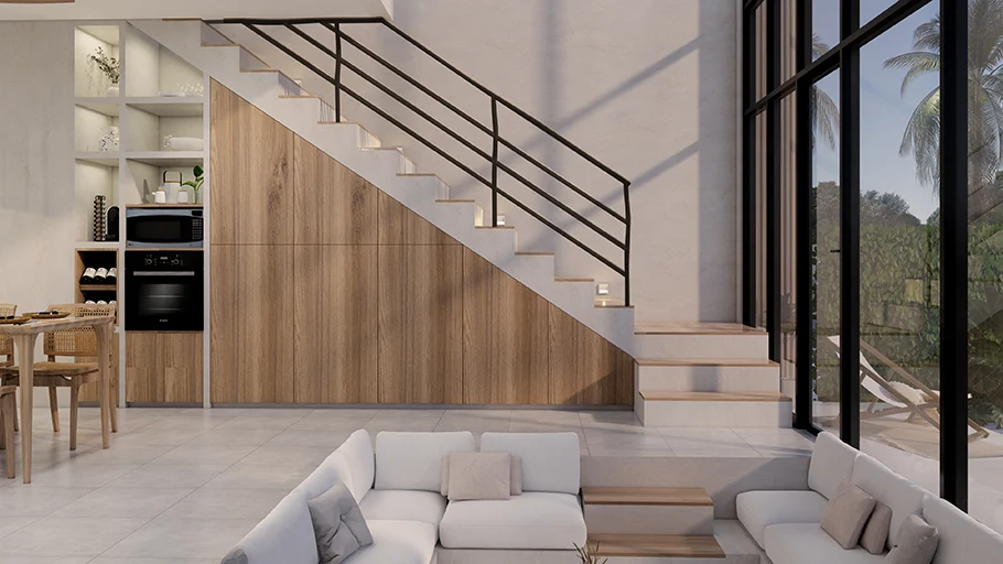 Sundari Villa wyróżnia się spójnością stylu – neutralna paleta barw, naturalne materiały i wysoka jakość wykonania budują atmosferę, która przemawia do szerokiego grona najemców. Zatopiona sofa w salonie, wiklinowe lampy, drewniane detale i duże przeszklenia od podłogi do sufitu to elementy, które jednocześnie podnoszą fotogeniczność willi i wrażenie luksusowości. Wszystko to zaprojektowane i dostarczone pod klucz.